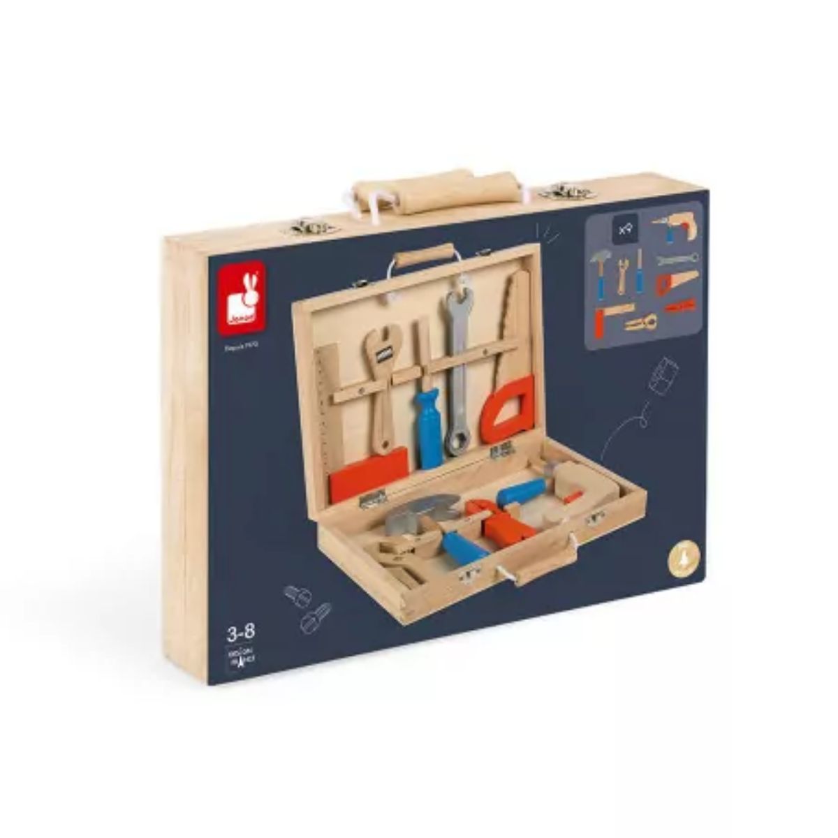 Passe-me a chave inglesa! Como a mãe e o pai fazem tarefas domésticas ou gostam de fazer alguma coisa "faça você mesmo" de vez em quando, você deve ter notado que seu filho quer imitá-lo e ajudá-lo à sua maneira? Esta caixa de ferramentas contém todo o equipamento que seu filho precisa para fazer como os adultos, com total segurança! Este estojo de madeira para faz-tudo contém 9 ferramentas: um martelo, uma chave de fenda, uma furadeira, uma serra, uma chave ajustável, uma chave inglesa, uma régua e 2 alicates. Graças ao seu estojo fácil de transportar, crianças a partir de 3 anos podem levar essas lindas ferramentas para todos os seus canteiros de obras favoritos!