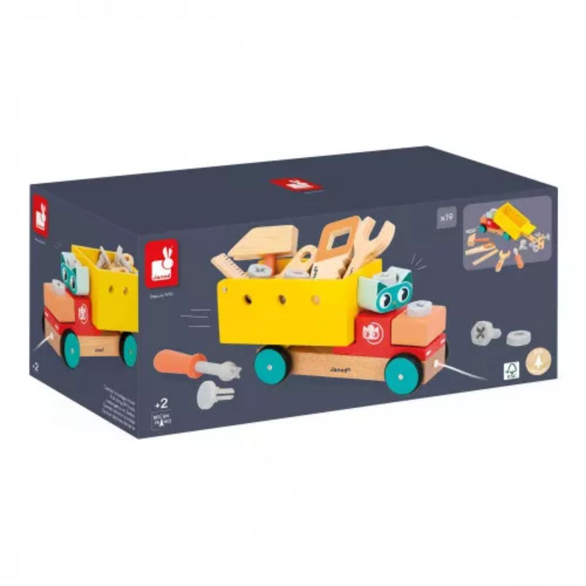 Um verdadeiro jogo de construção entre duas caminhadas, este caminhão faça você mesmo vem com uma infinidade de acessórios e ferramentas! Inclui: 5 ferramentas (chave de fenda, chave inglesa, serra, régua e martelo), 4 peças de madeira, 10 acessórios de parafusos de plástico. Os parafusos são entalhados para dar ainda mais realismo e facilitar o manuseio pelas mãozinhas das crianças.