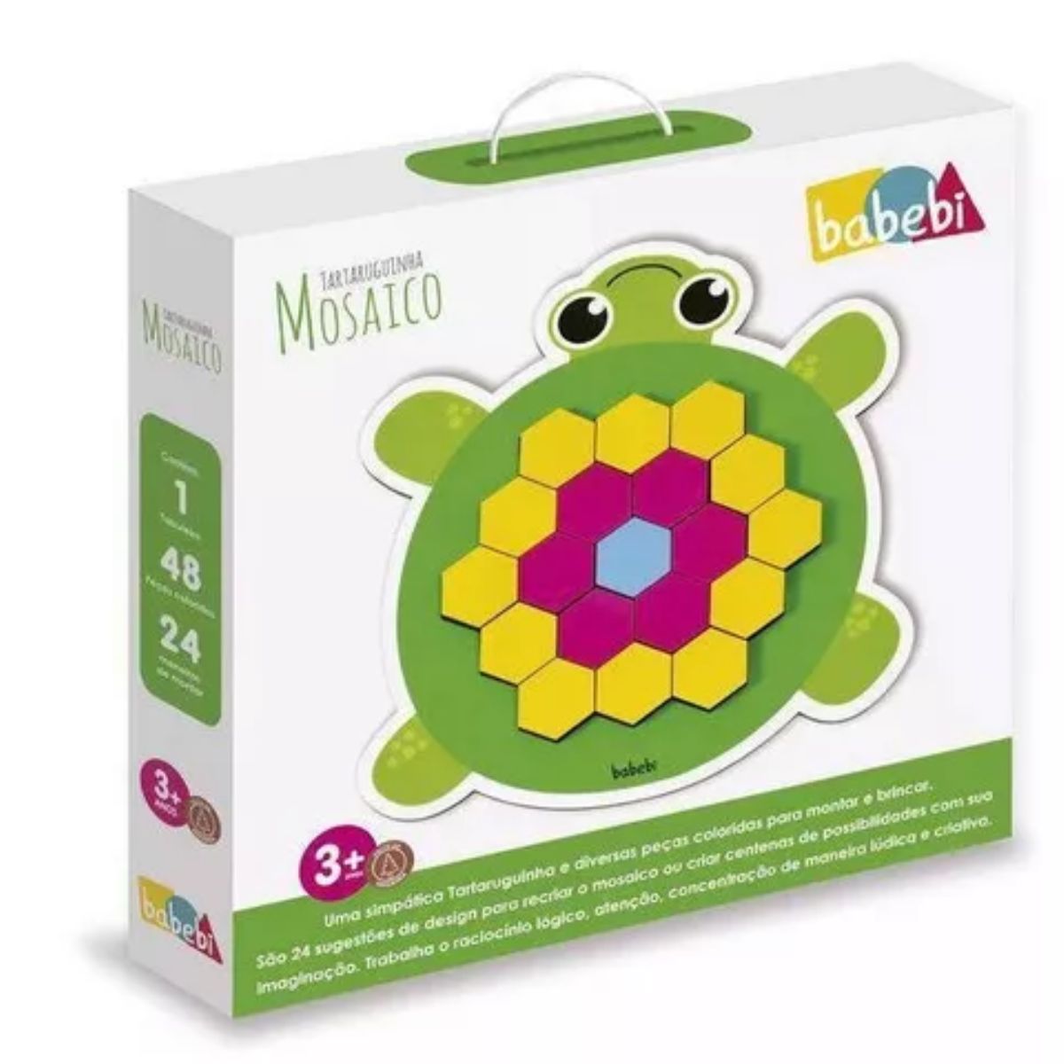 Uma simpática Tartaruguinha e diversas peças coloridas para montar e brincar com o mosaico. São 24 sugestões de design para reproduzir no tabuleiro ou simplesmente deixar livre a imaginação e criar centenas de possibilidades. Trabalha o raciocínio lógico, atenção, concentração de maneira lúdica e criativa.