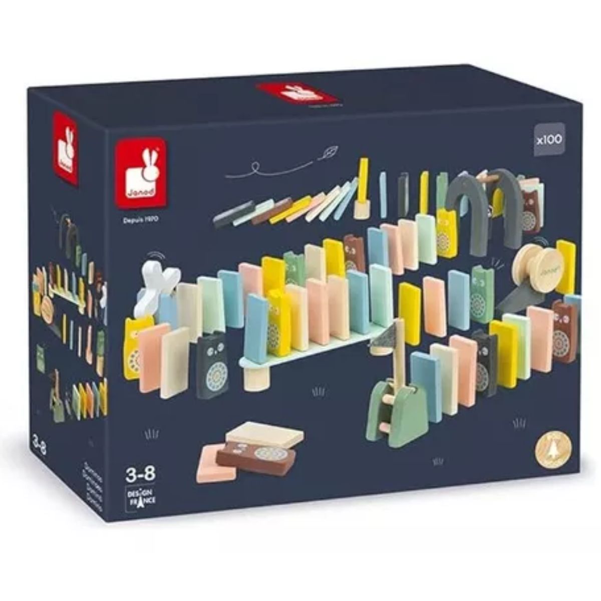 O dominó é um jogo clássico e atemporal. Descubra o jogo de dominó Sweet Cocoon: as 100 peças de madeira com cores da moda vão permitir que crianças a partir dos 3 anos criem percursos de obstáculos e desenvolvam a sua imaginação. Um número infinito de combinações são possíveis! Cones, ponte, moinho de vento, bandeira, sino, rampa e carretel estão incluídos para animar o percurso. Além de criar grandes memórias - repletas de partilha e risos - com a família ou amigos, este jogo é também educativo: é ideal para explorar a relação de causa e efeito; use os dominós para enfatizar esse conceito, essa noção e demonstrar para as crianças que toda ação tem consequências. Paciência e meticulosidade são necessárias para montar todas as peças... e derrubá-las todas de novo!