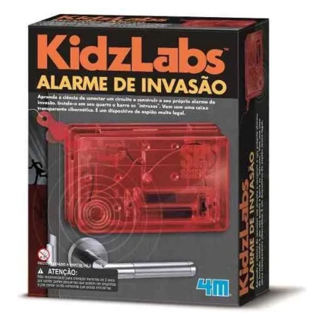 Com o Kit Alarme de Invasão 4M aprenda a ciência de conectar um circuito e construir o seu próprio alarme de invasão. Instale-o em seu quarto, colocando-o atrás da porta e barre os "intrusos" que tentarem entrar. Vem com uma caixa transparente cibernética. É um dispositivo de espião muito legal.