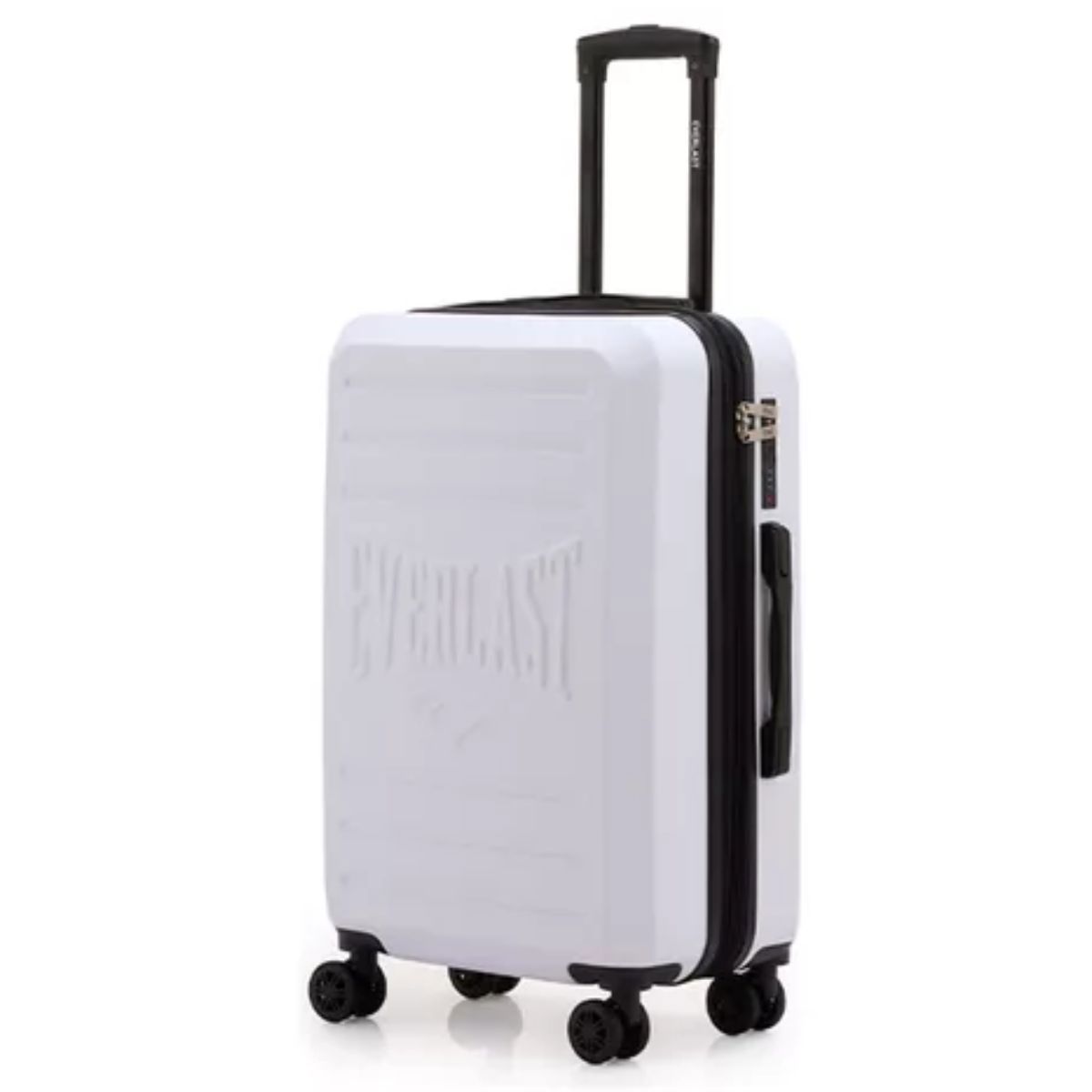 Mala de viagem em ABS com tubo do carrinho em aço, alça em plástico, rodas spinner, rodas duplas em plástico, cadeado TSA incorporado, compartimento interior, tiras ajustáveis e expansível.