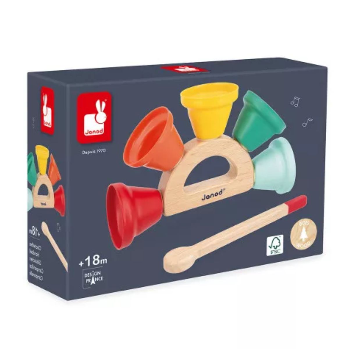 Composto por 5 lindos sinos de metal, presos a um cabo de madeira e uma varinha para fazê-los tocar, este brinquedo de despertar sonoro é realmente encantador. Fácil de manusear, este brinquedo para a primeira infância oferece uma introdução divertida aos sons.