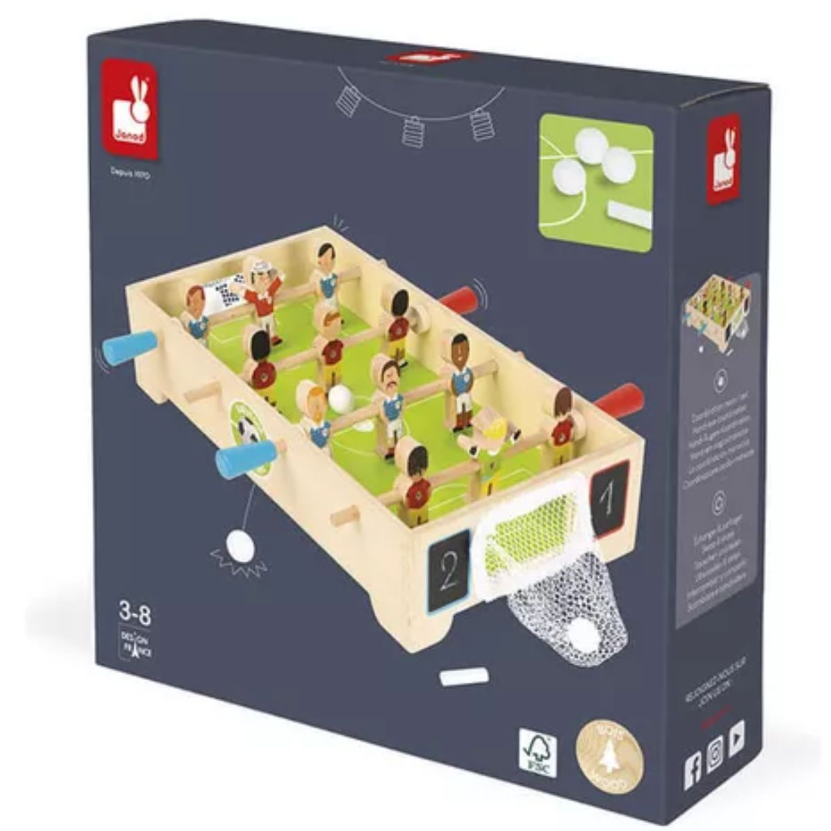 Mini jogo de pebolim em madeira composto por 4 filas de jogadores (12 jogadores no total) e 3 bolas de madeira - adequado para crianças a partir dos 3 anos.