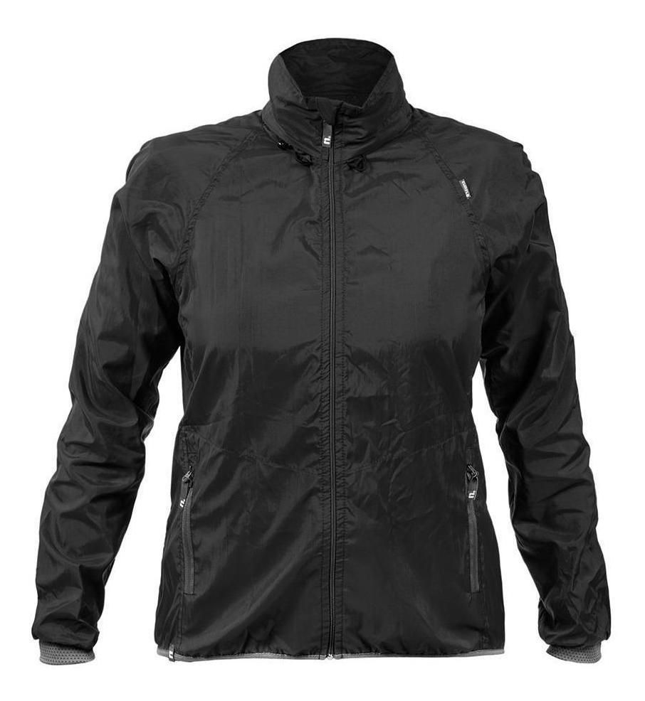 Jaqueta confeccionada em tecido Poliamida microfibra, que possui leve repelência à água. Possui abertura total e dois bolsos frontais com zíper, punho de compressão com elástico para evitar a entrada de vento, ventilação nas costas e elástico em toda a extensão da barra. Seu capuz é anatômico, com aba de borracha flexível e ajuste em cordão, ele pode ficar embutido na gola quando não estiver em uso. A jaqueta possui um bolso interno com fechamento em velcro que vira bolsinha para carregar a própria peça, tornando-se compacta e de fácil transporte. Possui faixas refletivas traseira nas costas, que auxiliam a visualização do usuário em atividades noturnas. Detalhes em contraste nas costuras e nos zíperes.