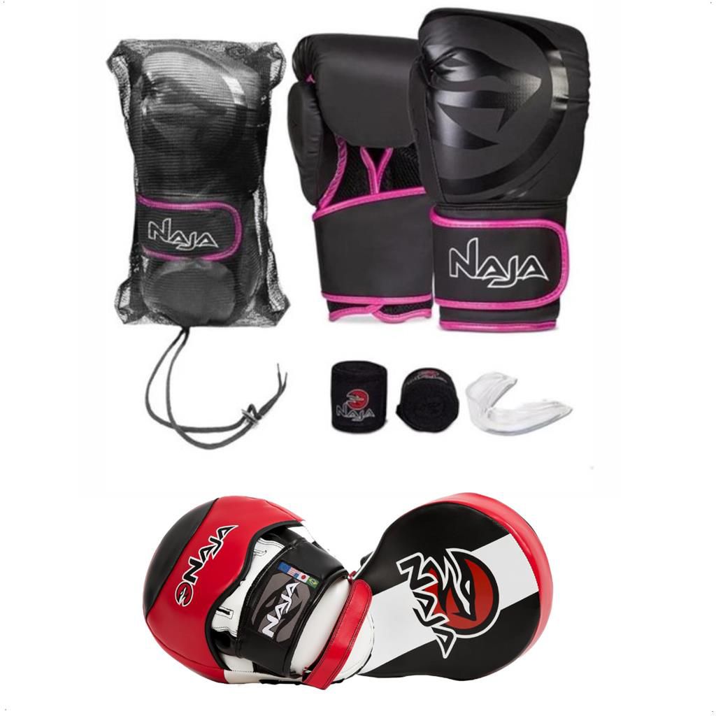 Kit Muay Thai Boxe Naja Luva Preta e Rosa 10 Oz + Manopla de Foco Naja