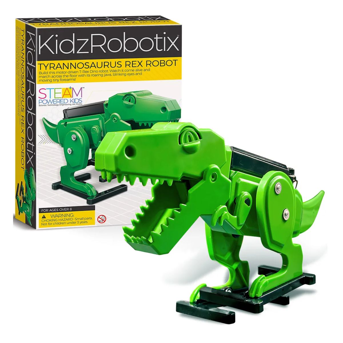 Construa esse Robô T-Rex movido pelo motor. Observe-o ganhar vida e caminhar, movendo suas mandíbulas e rugindo, olhos piscando e pequenos antebraços se movendo.
