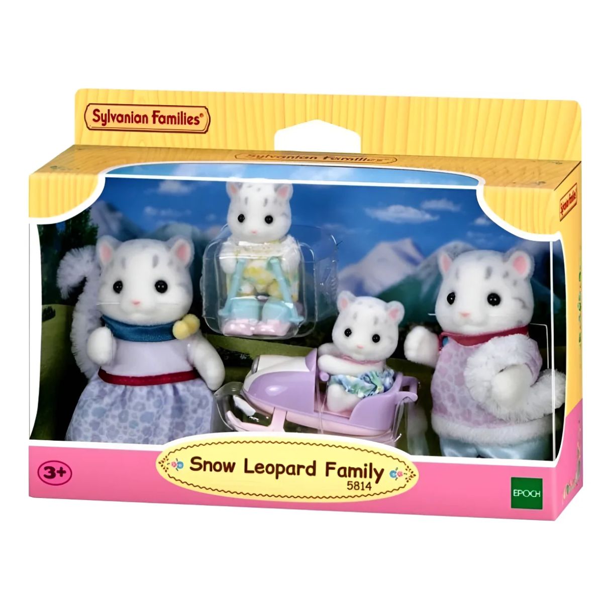 A Família Leopardo das Neves é composta por quatro bonecos: mãe, pai e gêmeos. Inclui uma moto de neve e esquis. Todos são articulados e cuidadosamente vestidos. Suas roupas podem ser tiradas e vestidas à vontade.