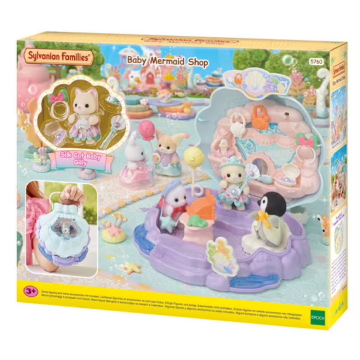 O kit Loja da Bebê Sereia contém uma loja em formato de concha, acessórios com tema oceânico e uma bebê Gato de Seda. Os acessórios podem ser expostos na loja ou usados pelo bebê. Quando a loja é fechada, transforma-se em uma bolsa em forma de concha, com o bebê à mostra! Abra a concha e comece a se preparar para receber os clientes na Loja da Sereia. Assim que todos os acessórios estiverem expostos, é hora de abrir!